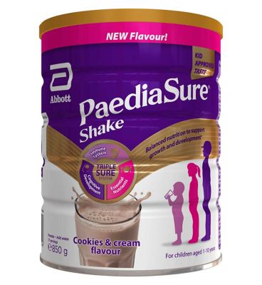 PediaSure Shake offers balanced nutrition in a Cookies & Cream flavour for children aged one to ten years. This 850g tub provides complete peace of mind regarding your child's daily intake needs. The product is formulated to support ongoing growth and development with a kid-approved taste profile.