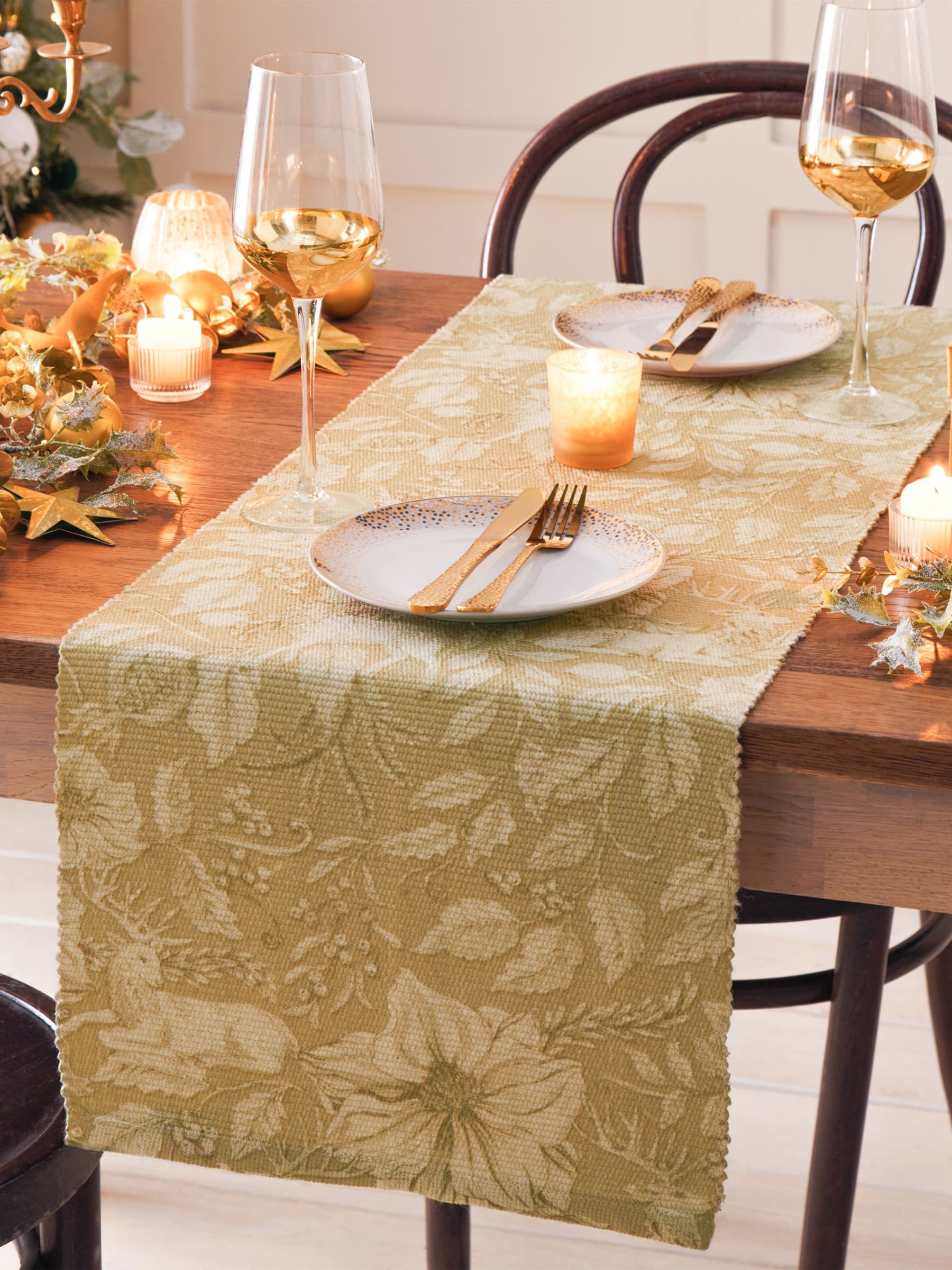 An intricately designed festive table runner, which adds intrigue to your Christmas table décor. This classic digital print features opulent fruits and florals, which bloom and grow frequently across the design amongst the elegant, strutting stags. All set against a rich golden background, providing added splendour to transform your Christmas dining table into something truly fabulous!