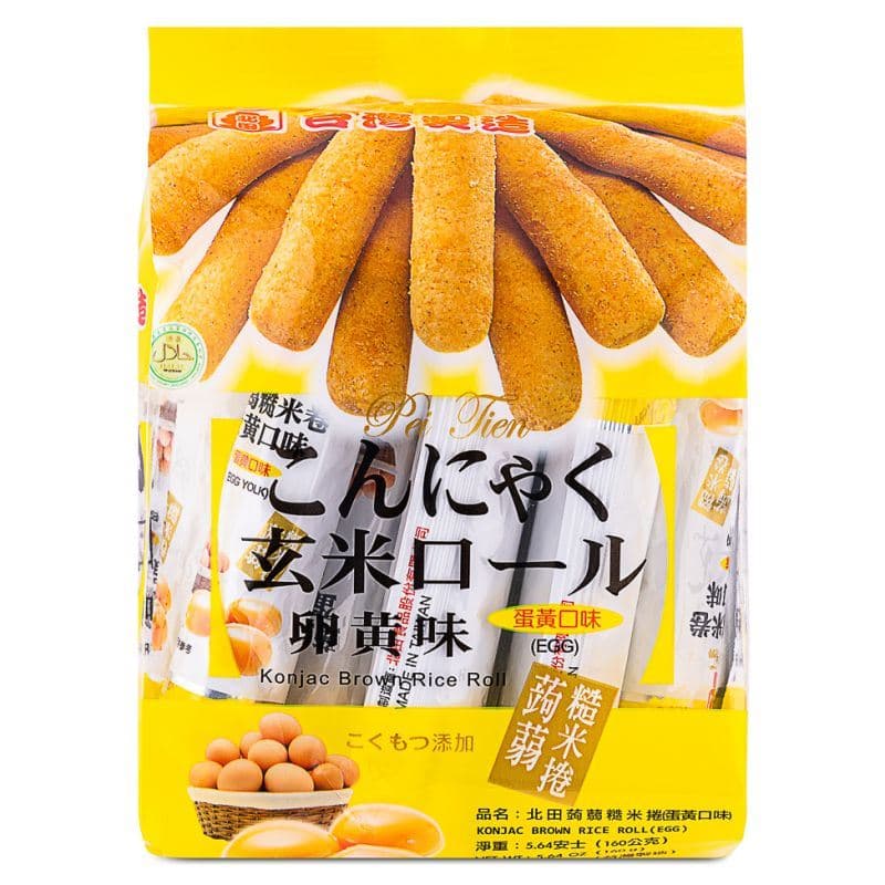 Pei Tien's Konjac Brown Rice Rolls (Egg Flavour) are a light Taiwanese snack made using premium brown rice and natural konjac powder. These light, crispy rolls are flavoured with egg yolk for a creamy, almost custard-like flavour. They make a great snack or can be crushed up and scattered over puddings.