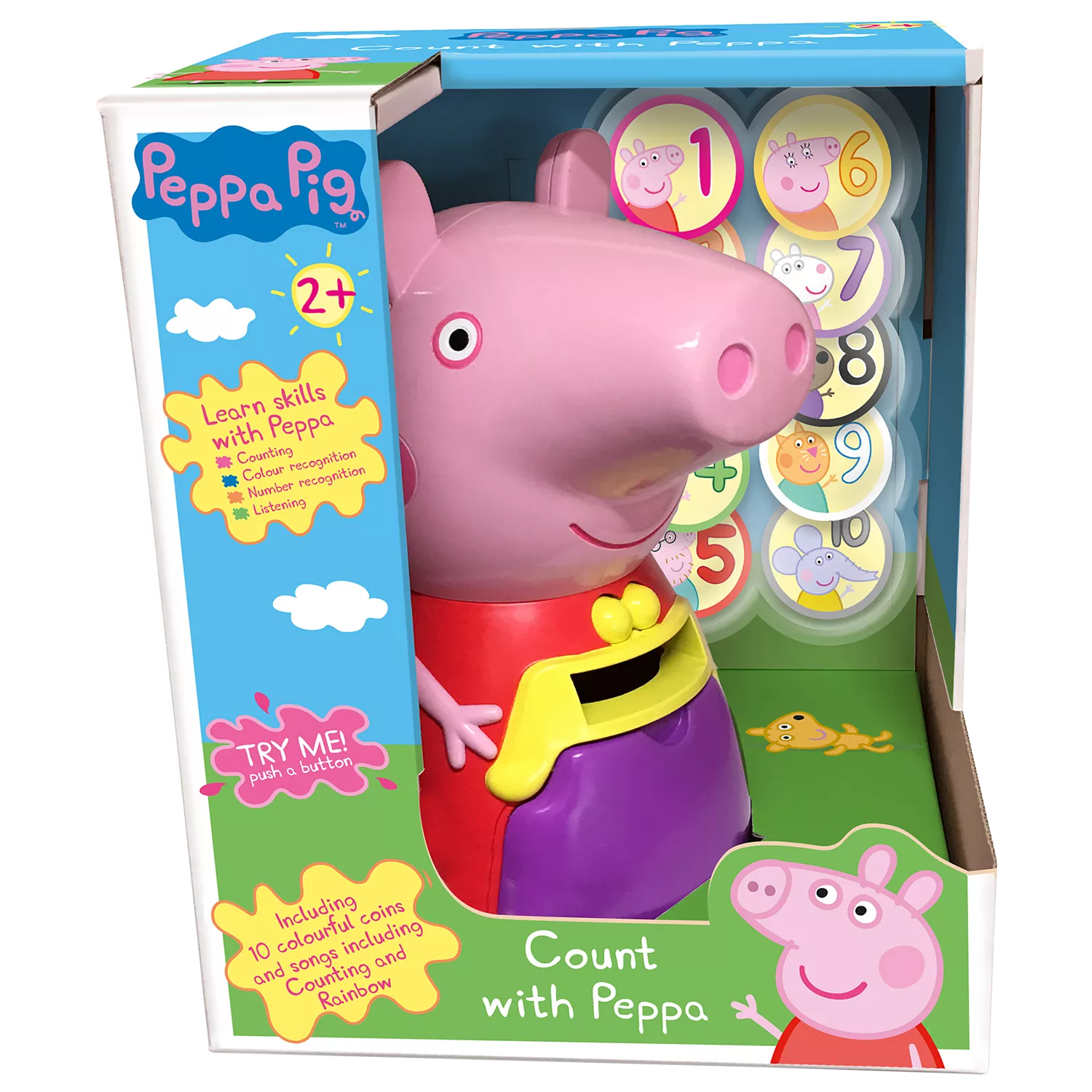 Peppa recognises which coins have been inserted and responds accordingly. With 8 different activities and 10 colourful coins, you can sing along with Peppa as you insert the coins in her purse.