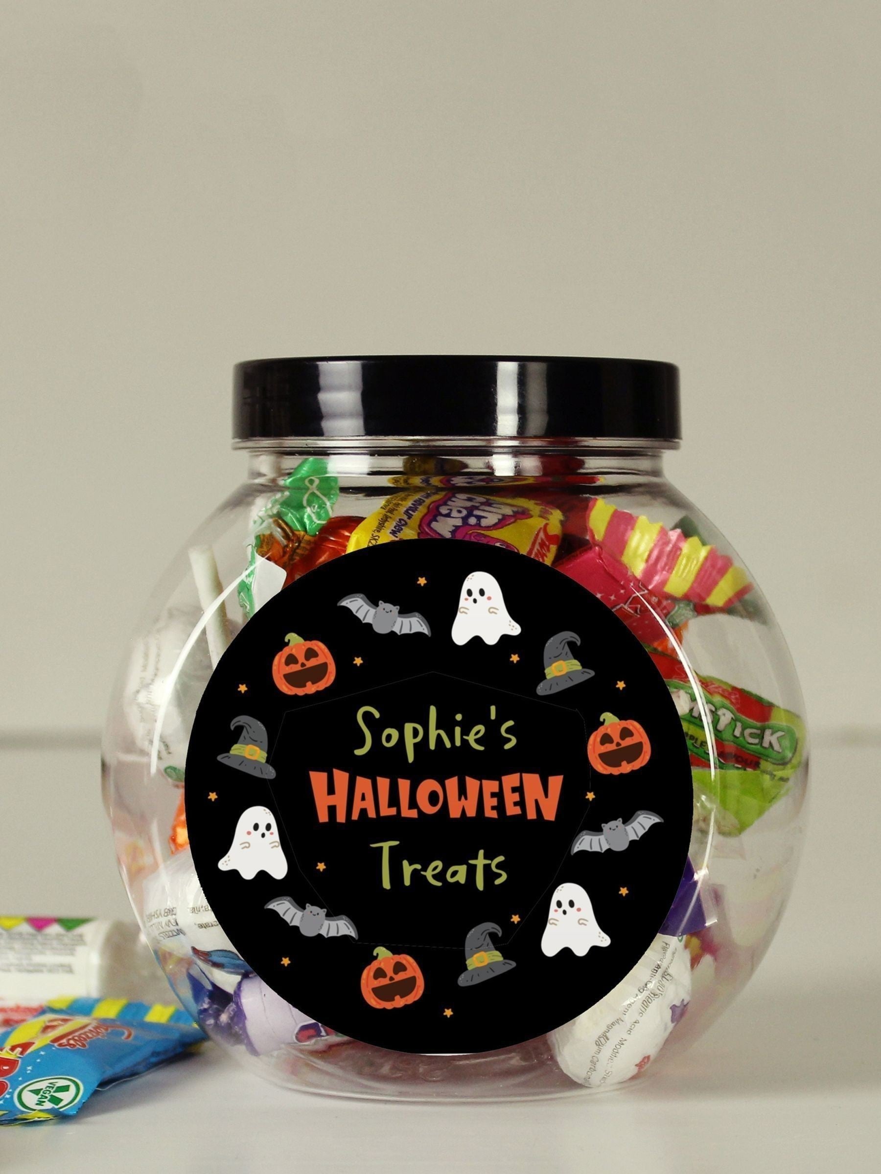 Personalise this Halloween Sweet Jar with a name above the fixed text ‘Halloween Treats’. The 250g Sweet Jar is plastic with black plastic screw top. The sweets are an assortment of Swizzles Matlow sweets. They Contain Traces of Nuts and are Halal Certified. Lollipops are a potential choking hazard and not suitable for children under 36 months.