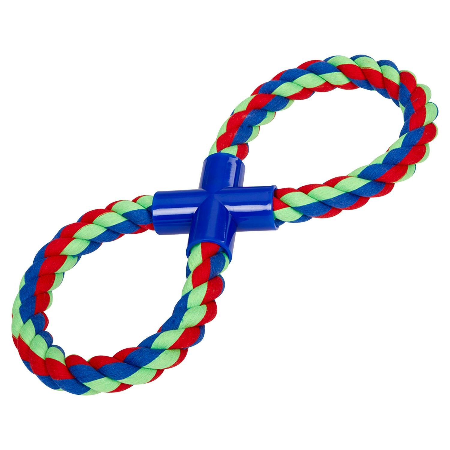 This Petface Toyz figure-of-8 is a robust dog chew toy featuring durable, multi-coloured braided rope for long-lasting interaction. It includes a bright blue plastic connector piece engineered to maintain the toy's structural integrity during vigorous play. This engaging design encourages natural chewing instincts and provides engaging exercise opportunities for your dog.