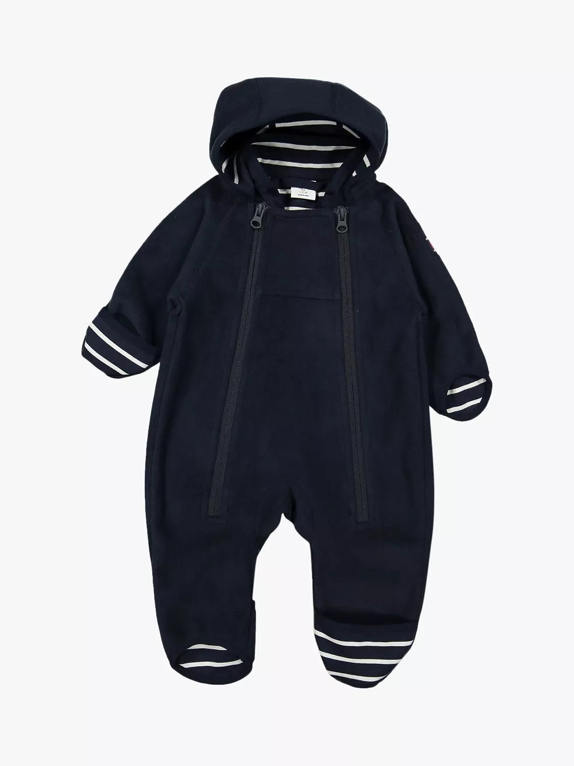 A water-repellent and windproof fleece all-in-one for baby. Perfect for the stroller! The garment has good breathability, and is made from 100% recycled polyester and lined with soft, striped jersey in 100% organic cotton. The all-in-one features an integral hood and two front zippers to facilitate dressing. The zippers have a storm flap that protects against the cold, and a chin guard that is gentle against the chin and cheeks.