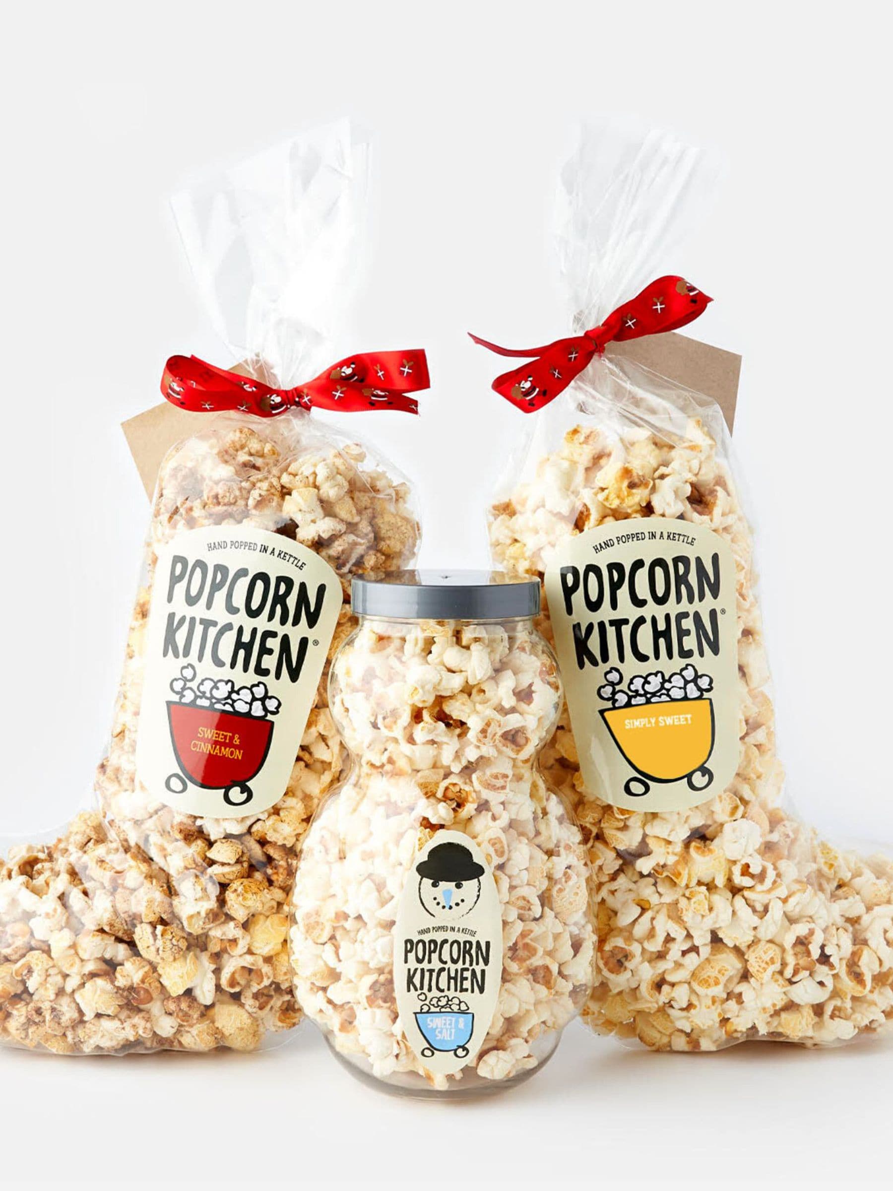 A festive themed selection that will keep the kids and the adults happy. The ideal Christmas Eve sharing pack or sensational stocking fillers! This pack contains 3 of our most moreish classic recipes: a Simply Sweet Christmas Stocking; a Sweet & Cinnamon Christmas Stocking; a Sweet & Salt Snowman. Simply Sweet Stocking 140g, hand-popped gourmet popcorn with a classic sweet coating, hand-packed into a novelty stocking with ribbon and tag. Sweet & Cinnamon Stocking 140g, a classic sweet popcorn recipe combined with a sprinkling of cinnamon creates a delicious festive favourite, andpacked into a novelty stocking with ribbon and tag. Sweet & Salt Snowman 60g - perfectly balanced and utterly moreish and packed into a novelty Snowman jar. Gluten free, vegan. Hamper dimensions height 20cm x width 30 cm x length 47cm.