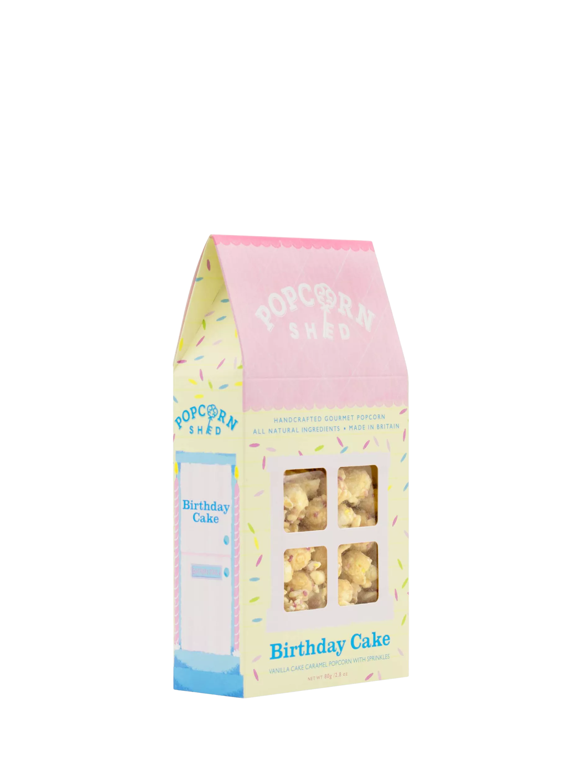 Vanilla cake caramel popcorn with white chocolate and sprinkles.