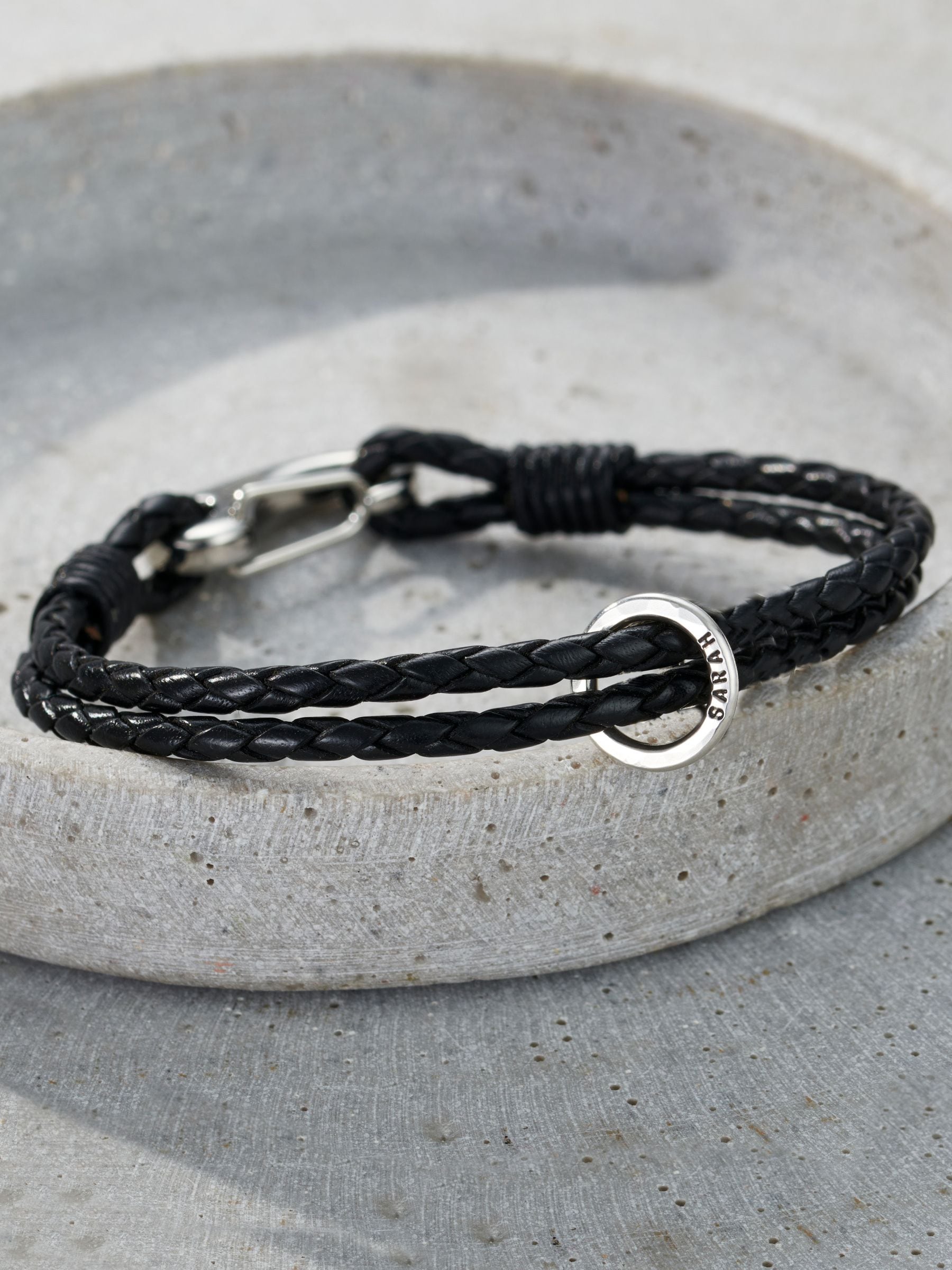 The gorgeous men's bracelet is made from woven leather and sterling silver. The design features: A double-strapped bracelet with a steel clasp Our jewellers then suspend a sterling silver message charm from the bracelet Each charm can be personalised with your words Perfect for names and dates of loved ones... Read More