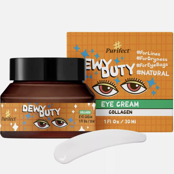 [FOR EYE BAGS, DRYNESS, AND LINES UNDER-EYE] Say bye to eye bags with Dewy Duty that helps improve the feel of firm and smooth around the eyes, giving you the dewy eyes you want! This eye cream is specially formulated with Sodium Hyaluronate to deliver moisture deep into the skin. This jar is also enriched with 7 types of collagen that will visibly lifts and tightens the under-eye area, resulting in more rejuvenated complexion. [KEY INGREDIENTS] include Collagen that helps prevent sagging skin and lines in the area and keeps your under-eye area firm and healthy by adding essential vitamins deep in skin cells, and Sodium Hyaluronate that intensely moisturizes and nourishes the skin around your eyes. Its main benefit is to retain moisture to keep the under-eye area refreshed and hydrated. [DAY & NIGHT EYE CREAM] For best results, use after cleanser and serums but before moisturizers. Use AM and PM daily. This highly active treatment will leave your under-eye complexion rejuvenated and youthful. [FOR CONSCIOUS CONSUMERS] If you like natural products with no harsh chemicals, this is the perfect eye serum for you. This product does not contain synthetic colors, parabens, sulfates, phthalates, etc. or anything you do not want near your skin. [SKINCARE INNOVATION] All of Purifect products are dermatologist-tested, made in U.S.A., suitable for all skin types, Leaping Bunny Certified for cruelty-free, NaVOBA certified for a veteran-owned organization, and formulated without any harsh chemicals.