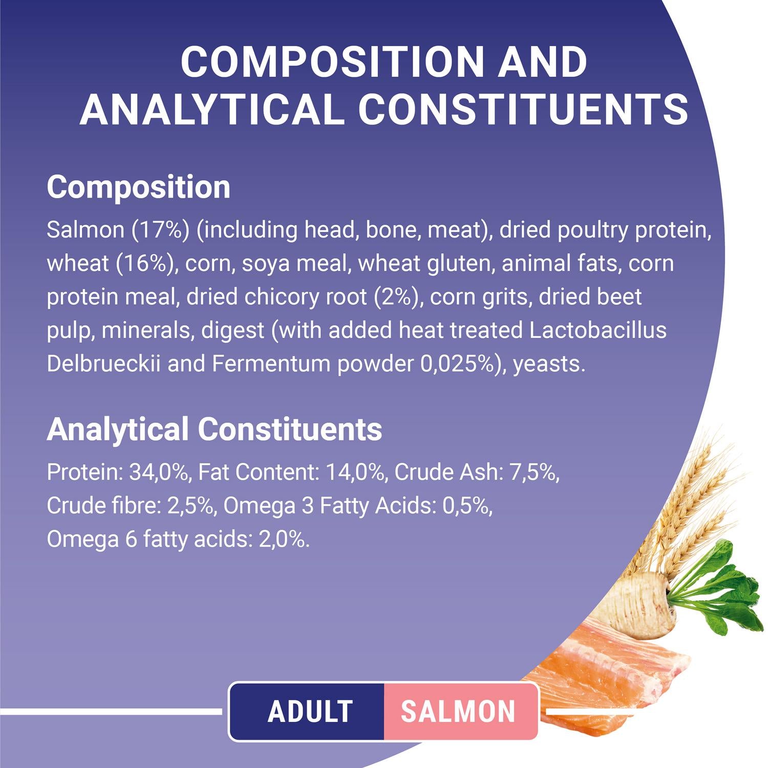 • Salmon is the primary ingredient, providing protein to help build and maintain strong muscles.