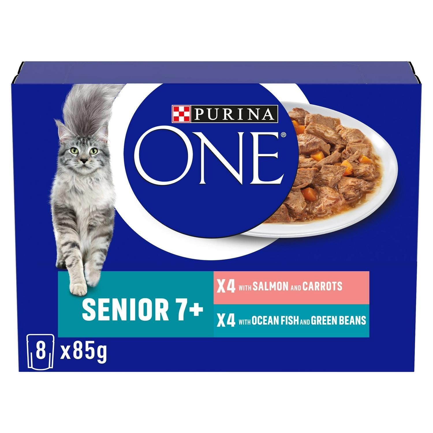 Purina ONE Senior 7+ wet food provides complete nutrition tailored specifically for mature cats. These salmon and ocean fish mini fillets support overall wellness and cater to the changing needs of older felines. This formula ensures a highly palatable mealtime experience.