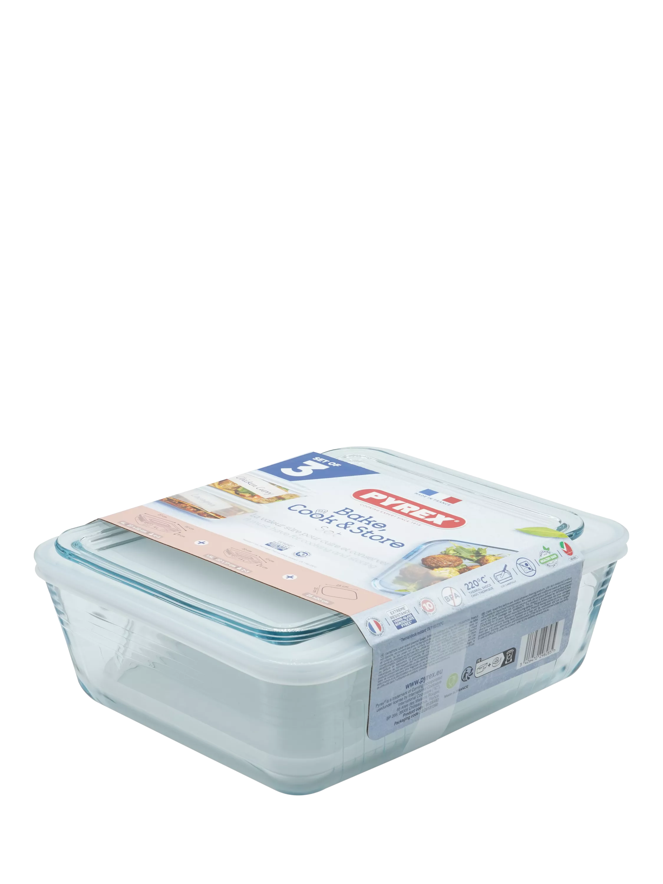 Three-piece Pyrex set of two borosilicate glass storage dishes complete with lids and a small borosilicate glass baking tray. Great for baking, cooking and storing in the freezer with the right proportions and minimum space requirements.