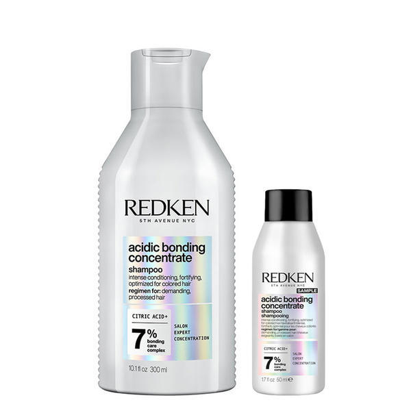 stock up and save with this handy redken acidic bonding concentrate shampoo duo duo includes redken acidic bonding concentrate shampoo 300ml and mini acidic bonding concentrate shampoo 50ml the expert acidic bonding concentrate shampoo works to cleanse strengthen and intensely condition hair while reinforcing weakened bonds formulated with citric acid and a concentrated bonding care complex this restorative redken shampoo is perfect for those with damaged demanding and processed hair boasting a luxurious ultrarich lather this advanced shampoo has a phbalancing effect to protect your locks against the negative impact of hair colouring styling and even water gentle on hair the unique acidic bonding concentrate shampoo leaves locks feeling more manageable smoother and shinier from root to tip key benefits up to 56 less breakage up to 76 of split ends appear reduced up to 11x smoother hair system tames frizz and adds intense shine phbalancing for colourfade protection for all hair types and textures contains citric acid an alpha hydroxy acid which conditions to help protect weak bonds sulphate free ingredients aqua water eau decyl glucoside sodium cocoyl isethionate cocamidopropyl betaine citric acid sodium hydroxide panthenol glycerin dimethicone peg150 distearate ppg5ceteth20 sodium benzoate sodium chloride peg55 propylene glycol oleate propylene glycol carbomer parfum fragrance cococaprylatecaprate polyquaternium67 salicylic acid amodimethicone sodium phytate glycol distearate cocobetaine acrylatesbeheneth25 methacrylate copolymer limonene trideceth6 brushing test when used as a system of acidic bonding concentrate shampoo and conditioner vs classic shampoo on bleached hair visual grading when used as a system of acidic bonding concentrate shampoo conditioner and leavein treatment vs classic shampoo on bleached hair when used as a system of acidic bonding concentrate shampoo conditioner and leavein treatment
