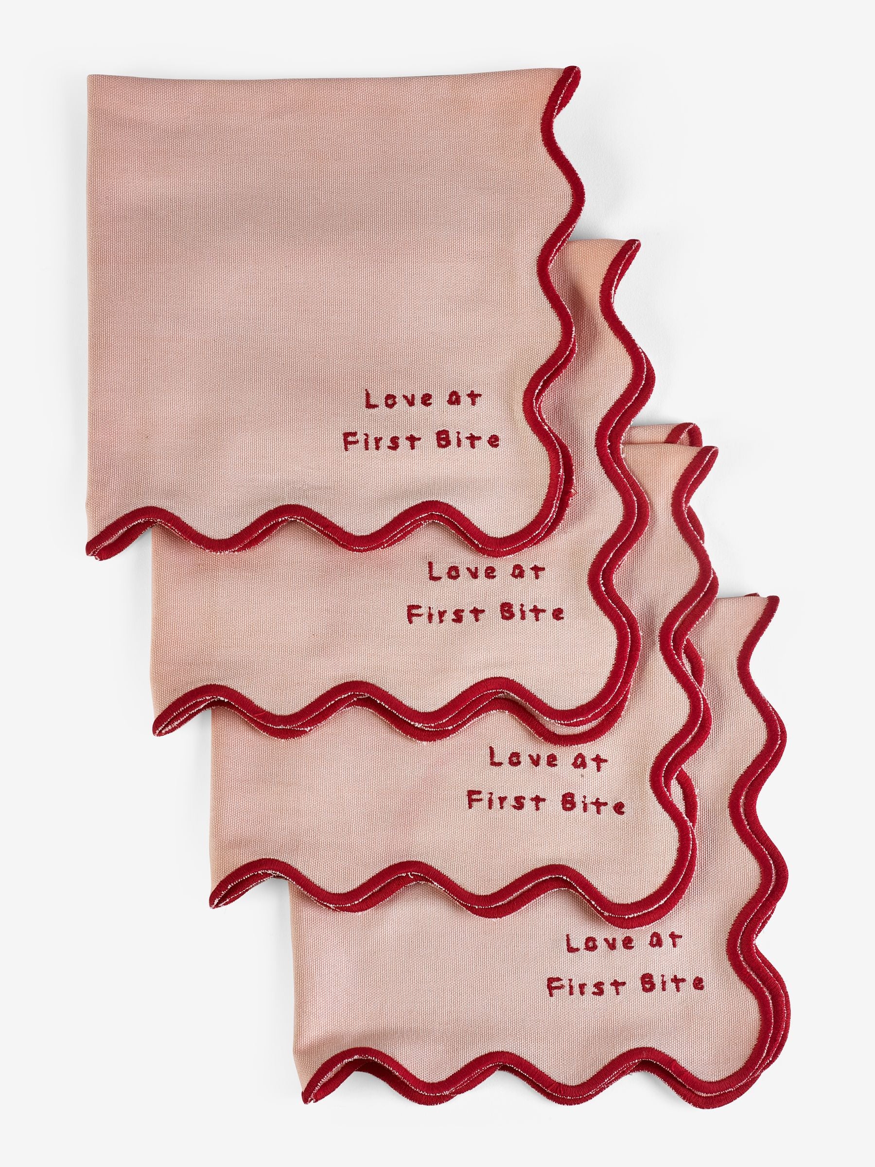 Add these quirky Rockett St George First Bite Napkins to your tablescape for a fun and flirty finish. Made from pure cotton with scalloped edges and embroidered slogan.
