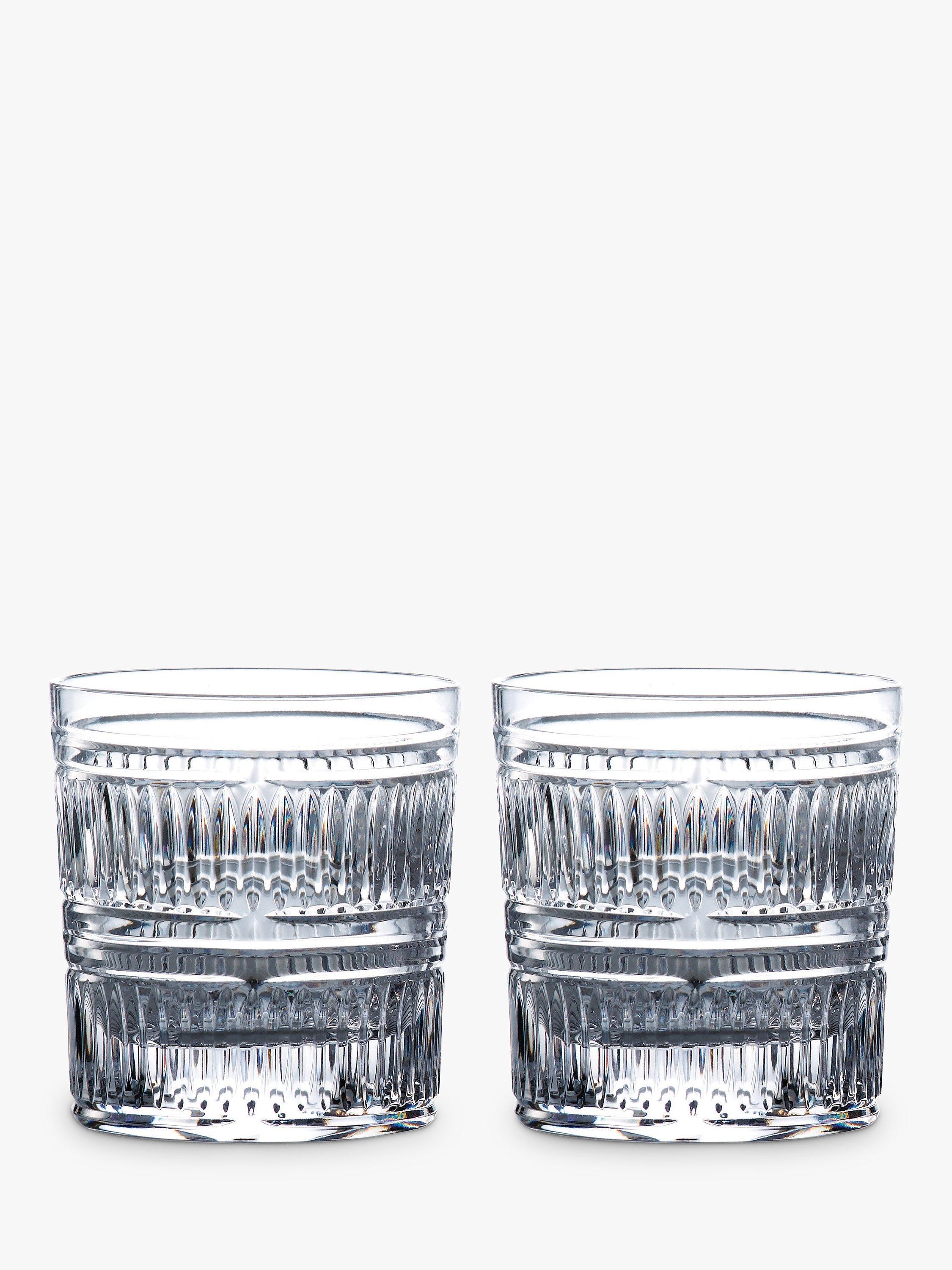 A pair of Radial tumbler glasses from Royal Doulton's R&D glassware collection. The retro-modern design is inspired by Art Deco architecture with a cut glass pattern of horizontal and vertical intersecting tactile cuts.