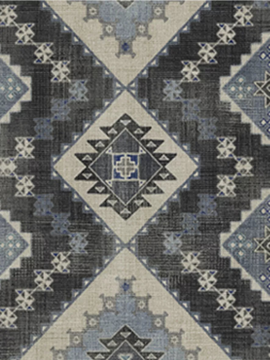 Geometric meets traditional. This rug features a central diamond medallion surrounded by repeating shapes. Water-resistant, stain-resistant, and machine-washable.