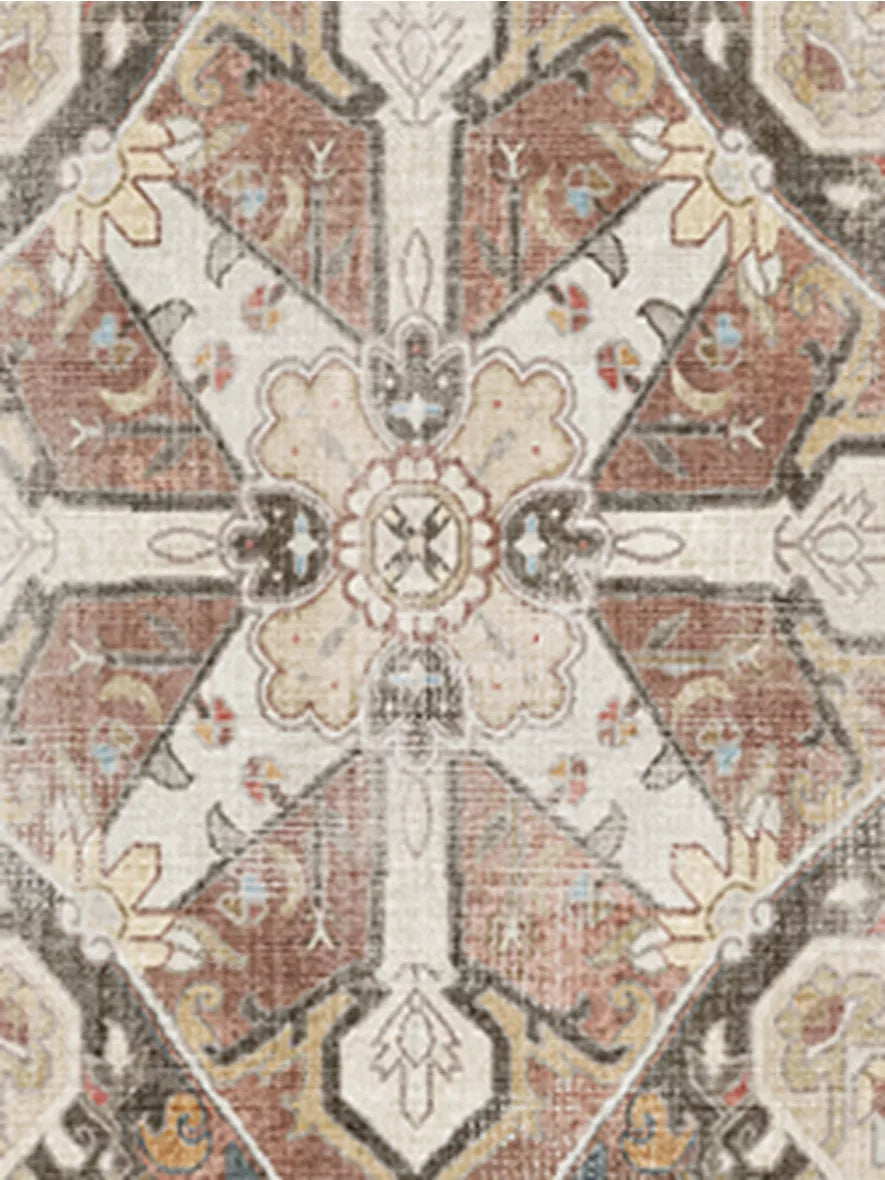A Persian design with a distressed look. Inspired by traditional Heriz rugs, Ruggable's Kamran rug features a large medallion with an ornate border in rich shades of vintage colours. Water-resistant, stain-resistant, and machine-washable.