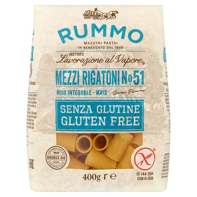 This Rummo Mezzi Rigatoni No 51 is a unique gluten free pasta crafted to deliver the pleasure and texture of traditional varieties. It is made from a careful blend of rice and corn, strictly GMO-free, offering a quality alternative for restricted diets.