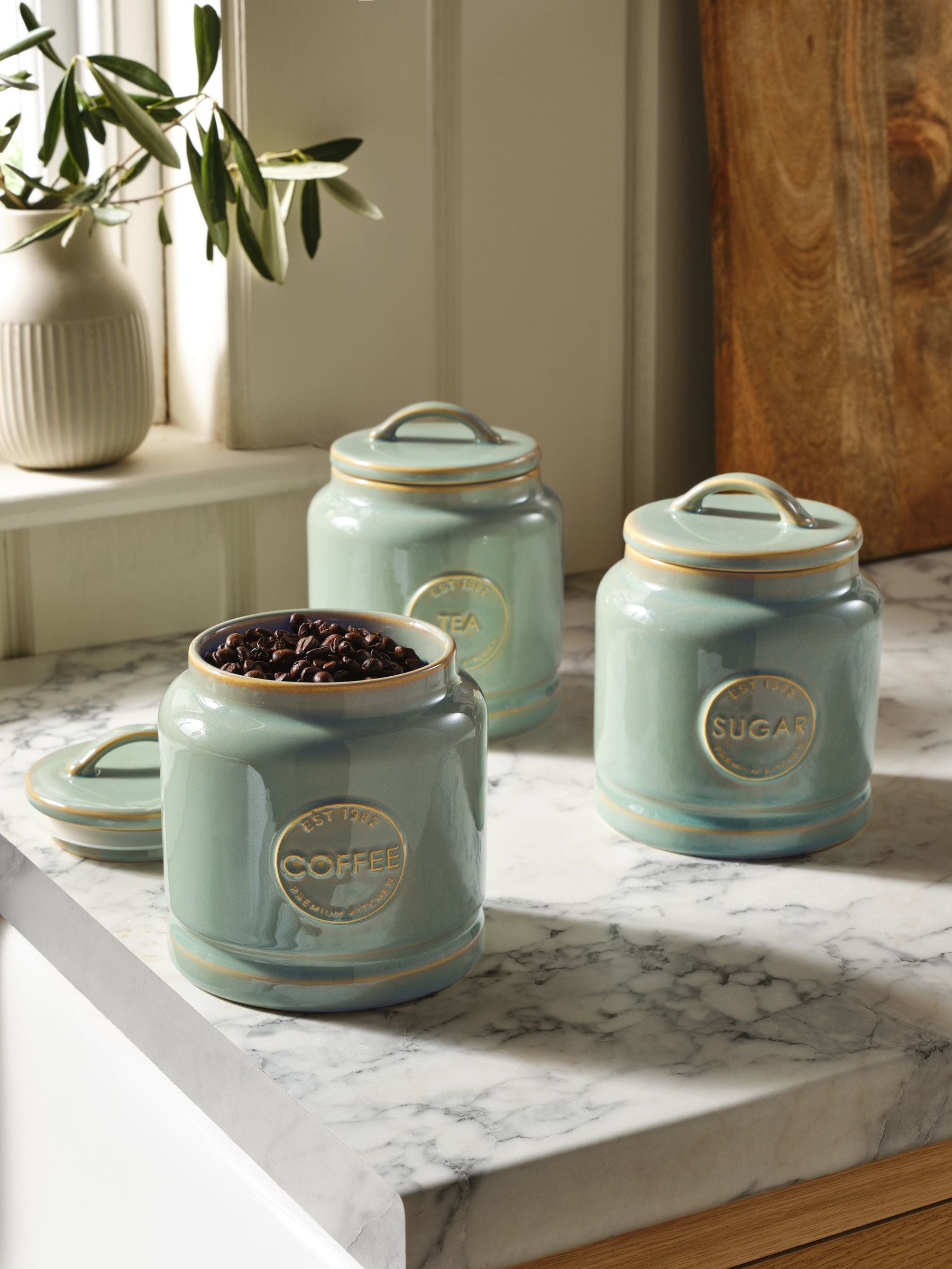 A beautiful addition to any worktop or shelf, this set of 3 sage green stoneware storage jars in a sage stone finish and embossed badge design. Perfect for storing your tea, coffee and sugar.