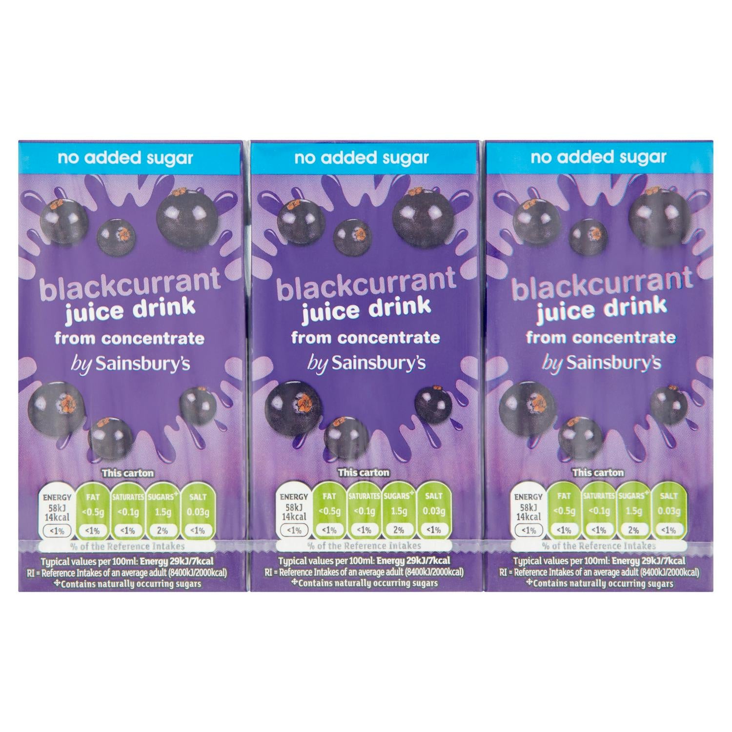 This Sainsbury's Blackcurrant juice drink is supplied in a convenient multipack of three 200ml cartons. It delivers a rich fruit flavour without any added sugar, relying only on naturally occurring fruit sugars.