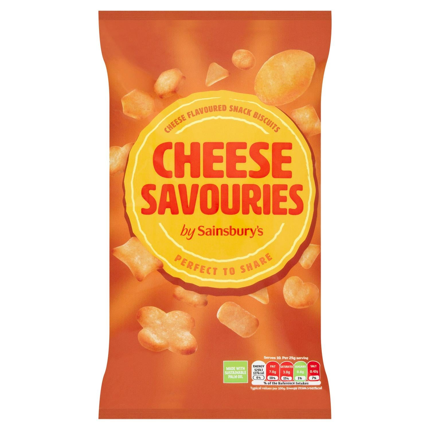 Sainsbury's Cheese Savouries offer a selection of cheese-flavoured snack biscuits ideal for sharing with friends or family. These savoury items provide a satisfying texture and distinct cheese taste derived from the savoury flavouring. The packaging clearly promotes their suitability for social occasions.