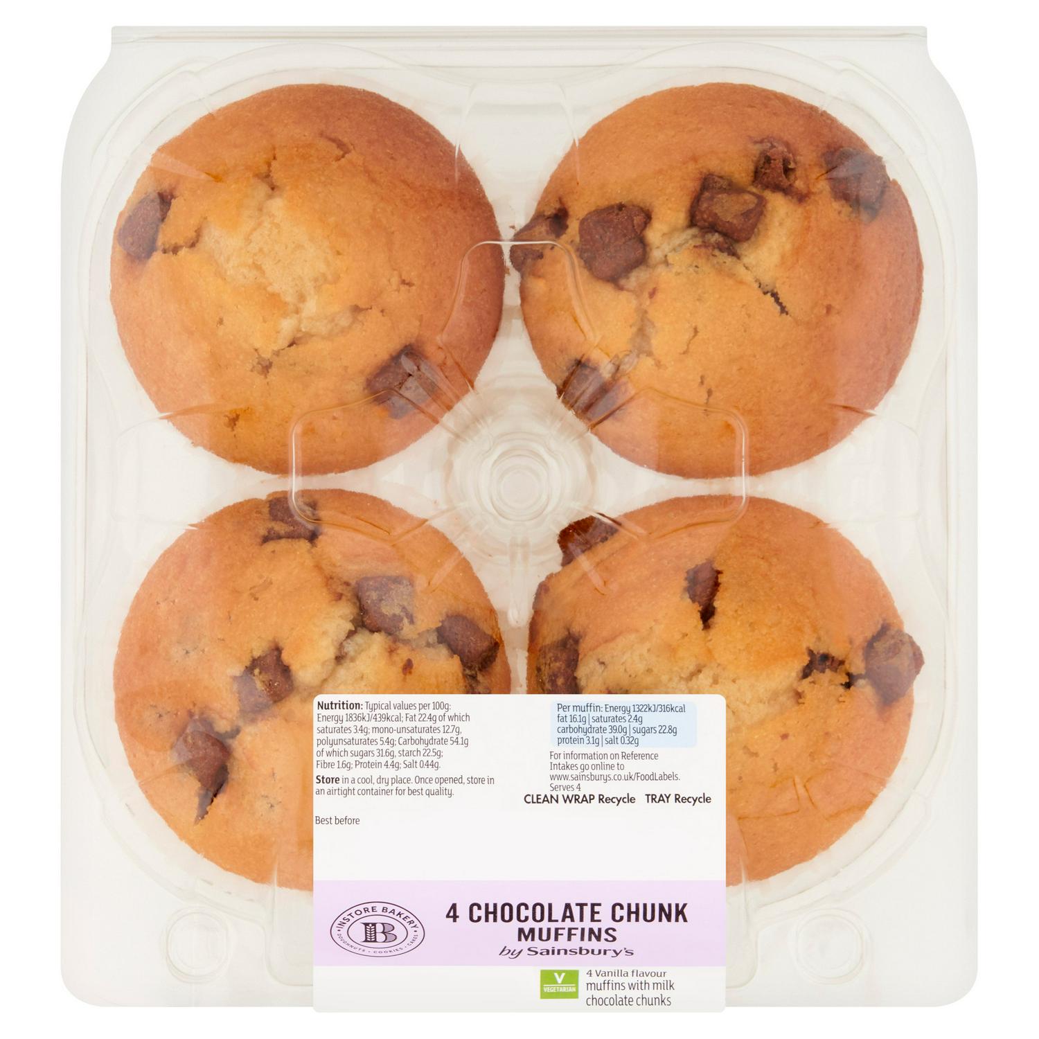 These Sainsbury's Instore Bakery treats feature four vanilla-flavoured muffins generously studded with milk chocolate chunks. Baked fresh for quality, these convenient baked goods offer a comforting taste experience ready for consumption. They are presented in a practical four-pack ideal for immediate sharing or personal enjoyment.