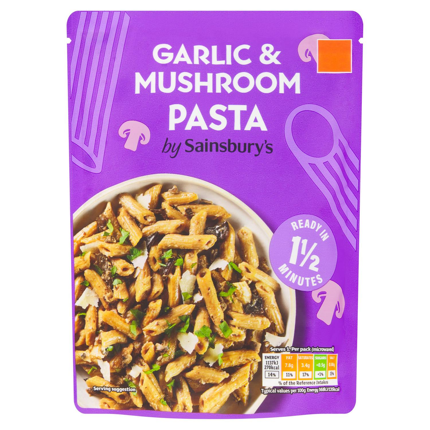 By Sainsbury's Garlic & Mushroom Pasta delivers a satisfying single serving that is ready extremely quickly from the fridge. This chilled ready meal combines penne pasta with a creamy sauce, rich roast garlic notes, and pieces of mushroom for flavour. The packaging clearly highlights its speed, making it ideal for busy schedules requiring minimal preparation effort.