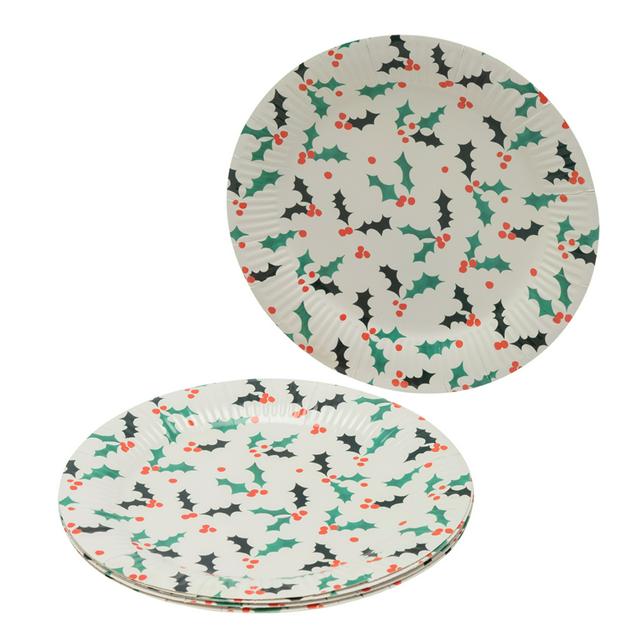 These paper plates from Sainsburys Home are ideal for festive gatherings and seasonal events. Each pack contains eight sturdy, single-use plates featuring a charming all-over print of green holly leaves and red berries. Measuring 23cm in diameter, they offer ample space for serving snacks or light meals during Christmas celebrations. The 300gsm paper construction provides necessary durability for temporary use. These Christmas paper plates should only be used for food contact and are not suitable for use in a microwave or dishwasher. Please ensure plates are free from food residue before considering recycling.