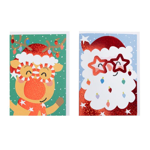 - Includes a card with Santa in glittery glasses and one with an excited Rudolph.