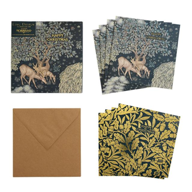 Send beautiful festive greetings this season with this pack of five luxury Christmas cards featuring a Morris & Co design. These cards capture the holiday spirit with glistening holly and seasonal deer imagery. The delicate gold highlights add a touch of seasonal warmth to your correspondence.