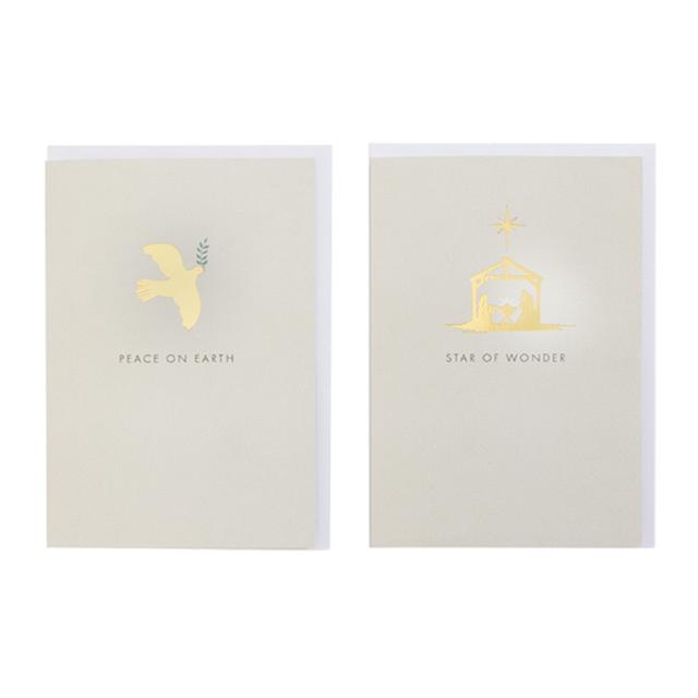 These luxury Christmas cards offer an elegant way to send seasonal greetings. The set includes ten cards featuring two distinct designs, highlighted with luxurious gold foil blocking for extra shine. A cool colour palette complements the striking graphics and meaningful messaging contained within.