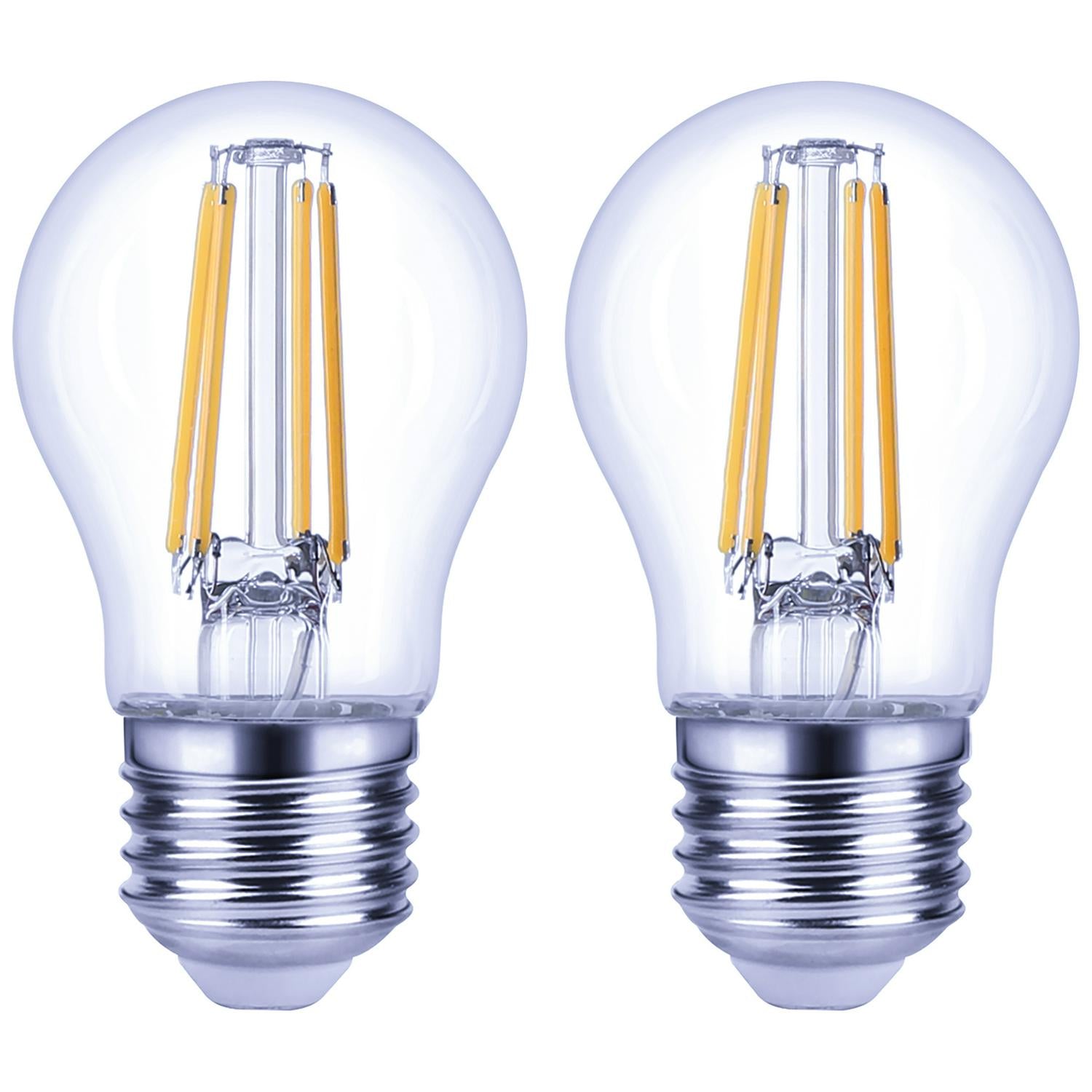 This pack contains two Globe-style light bulbs featuring modern LED filament technology. Using these energy-efficient bulbs can help reduce your household energy consumption by 85-90% compared to standard incandescent options. They are supplied with an ES (Edison Screw) fitting, offering a straightforward replacement for existing fixtures.