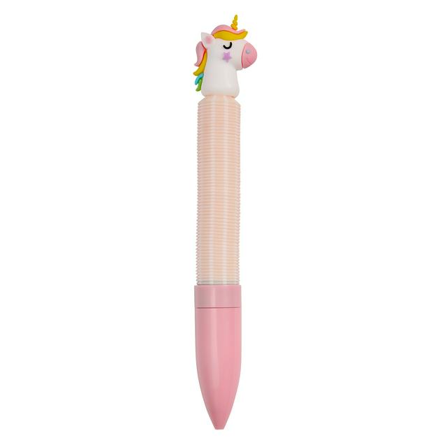 This magical unicorn stretchy pen is ideal for creative doodling and scribbling activities at school or home. Featuring a fun pink design and a retractable mechanism, this item is a visually interesting addition to your stationery collection. The pen is topped with a decorative unicorn detail, making it a standout piece for writing tasks.