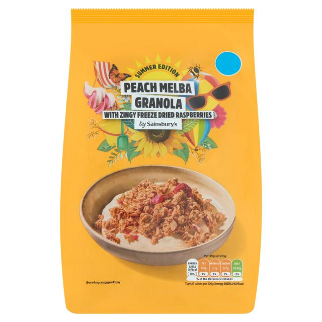 Enjoy the seasonal flavour of this Summer Edition Peach Melba Granola from Sainsbury's. This blend features honey toasted wholegrain oats complemented by sweet peach flavouring and tart freeze-dried raspberries. It provides a satisfying texture perfect for starting your day.