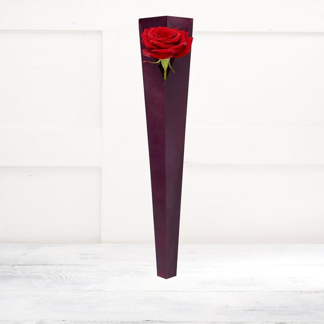This item features a single, vibrant red Naomi rose presented in a modern, dark geometric vase. The unique presentation offers an elegant, sophisticated focal point for any interior setting. This premium arrangement provides lasting visual appeal and requires minimal upkeep.