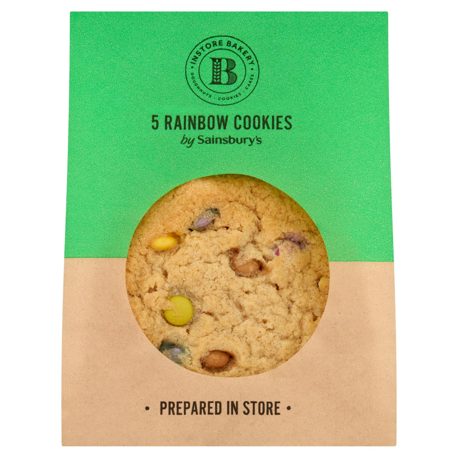These Sainsbury's Rainbow Cookies are prepared fresh within the bakery for immediate enjoyment. Each pack contains five substantial cookies featuring colourful candy beans with a satisfying cocoa centre. Enjoy the convenience and visual appeal of this freshly baked treat straight from the store.