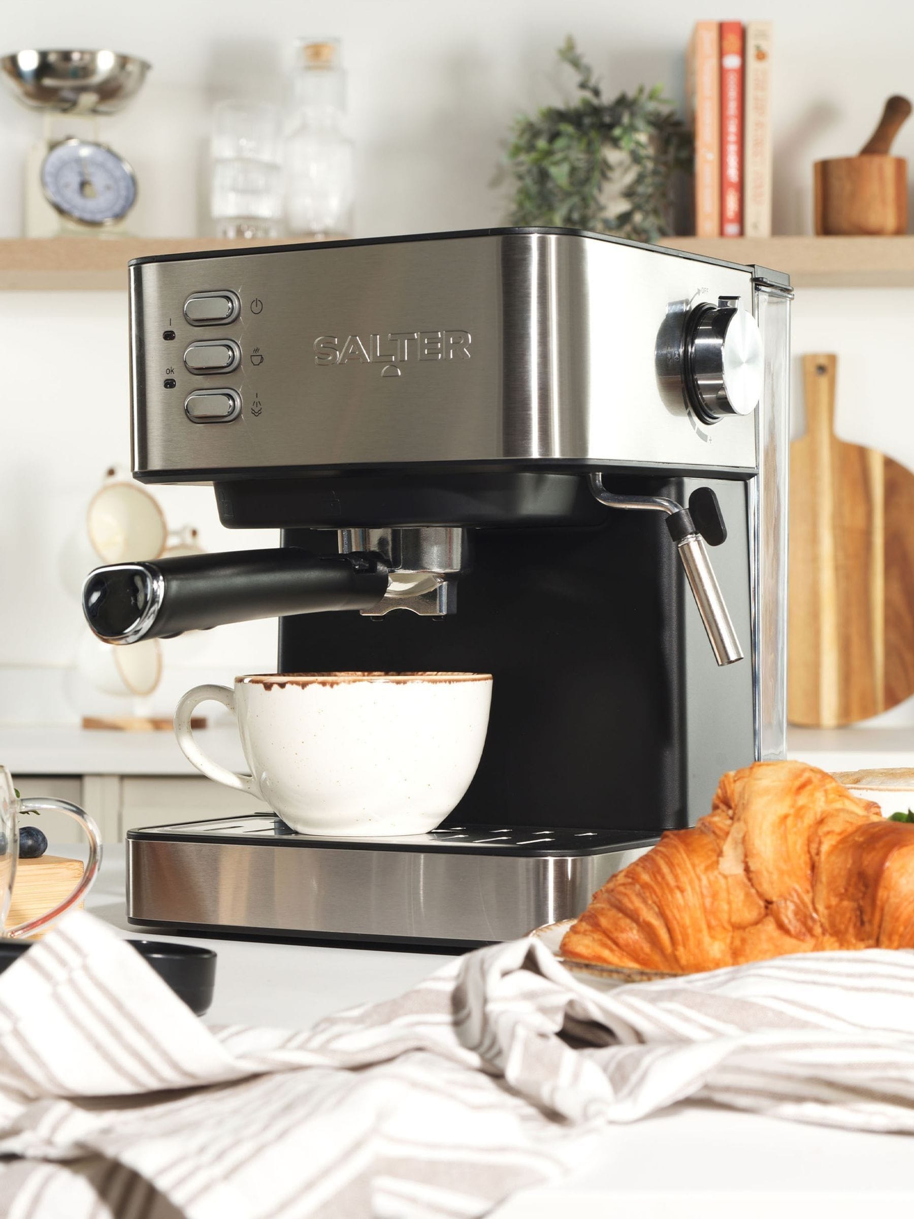 Designed for true espresso aficionados, this manual espresso machine from Salter ensures every coffee is a masterpiece. Equipped with a 15-bar Italian pressure pump to extract rich flavours from ground coffee, you can be your own barista! Use the included milk frothing wand to craft creamy lattes and foamy cappuccinos effortlessly. Featuring an easy-fill 1.6L detachable water tank, this coffee machine includes all the essential accessories with a measuring spoon, tamper, and portafilter.