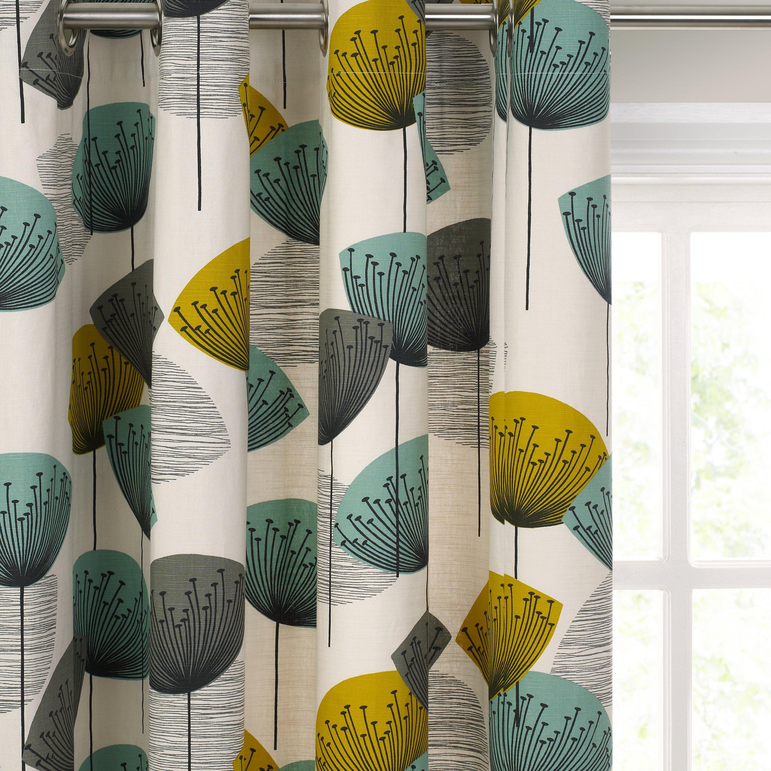 Explore the Sanderson Dandelion Clocks Pair Lined Eyelet Curtains Aqua. These robust window furnishings showcase a vibrant, retro 50s aesthetic, featuring stylised dandelion blooms in bold colour palettes. They are quick and easy to fit using the eyelet heading system, ensuring an instant, attractive finish for your home décor needs today.