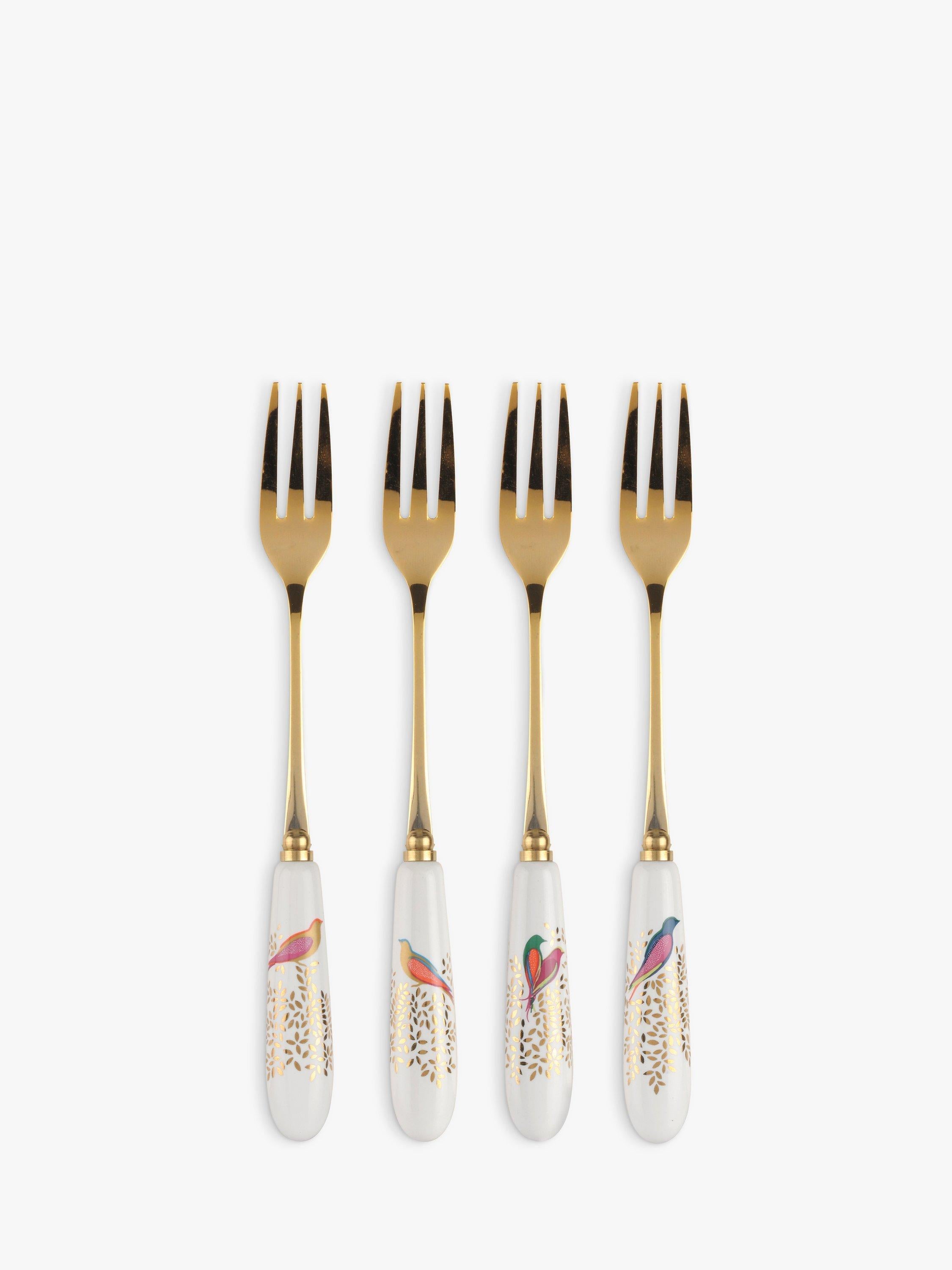 Elevate your dessert service with this Sara Miller Chelsea Collection pastry fork set. This assorted set contains four unique forks. Each fork features a fine china handle showing intricate bird motifs, highlighted by real 22-carat gold accents, offering an elegant addition to any table setting.