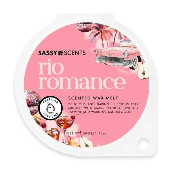 Experience the daring fragrance profile of the Sassy Scents Rio Romance wax melt. This 50g product blends sweet, floral, and warm notes to enhance your home atmosphere effectively. It is crafted from a rich soy blend wax base for a consistent release of its complex aroma.