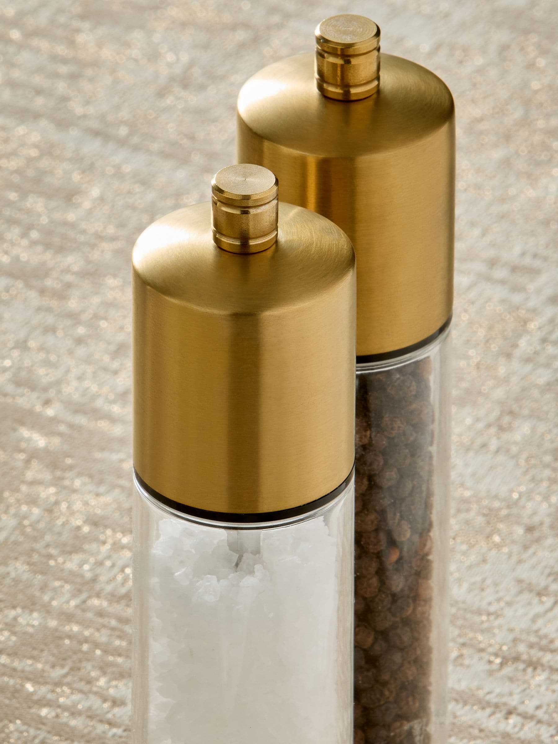 Season in style with this pre-filled salt and pepper set. Made from stainless steel with a beautiful, brushed gold finish, each piece comes with an easy-to-use grinder function and features a transparent body so you can easily see when you are running low on seasoning. This set arrives filled with salt and pepper, to ensure you are ready to season straight away!