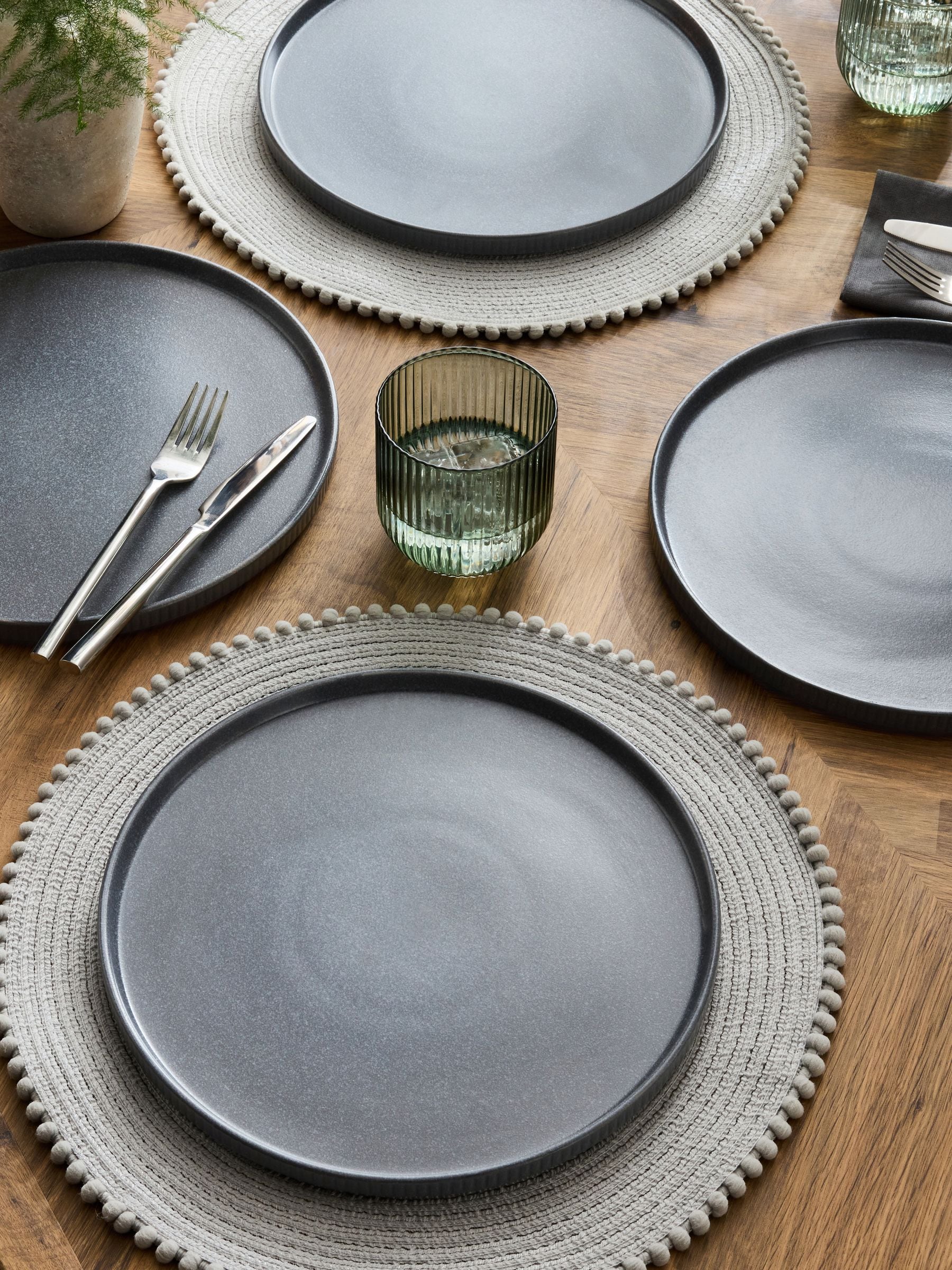 This dinner plate set is crafted from high-quality stoneware, offering a modern look. The set features a sleek, flat profile, adding a contemporary touch to any dining table. Each piece is subtly embossed with intricate riding details along the outer edge, which adds texture and a unique, rustic charm. The soft grey hue of the stoneware enhances its versatility, making it suitable for both casual and formal occasions.