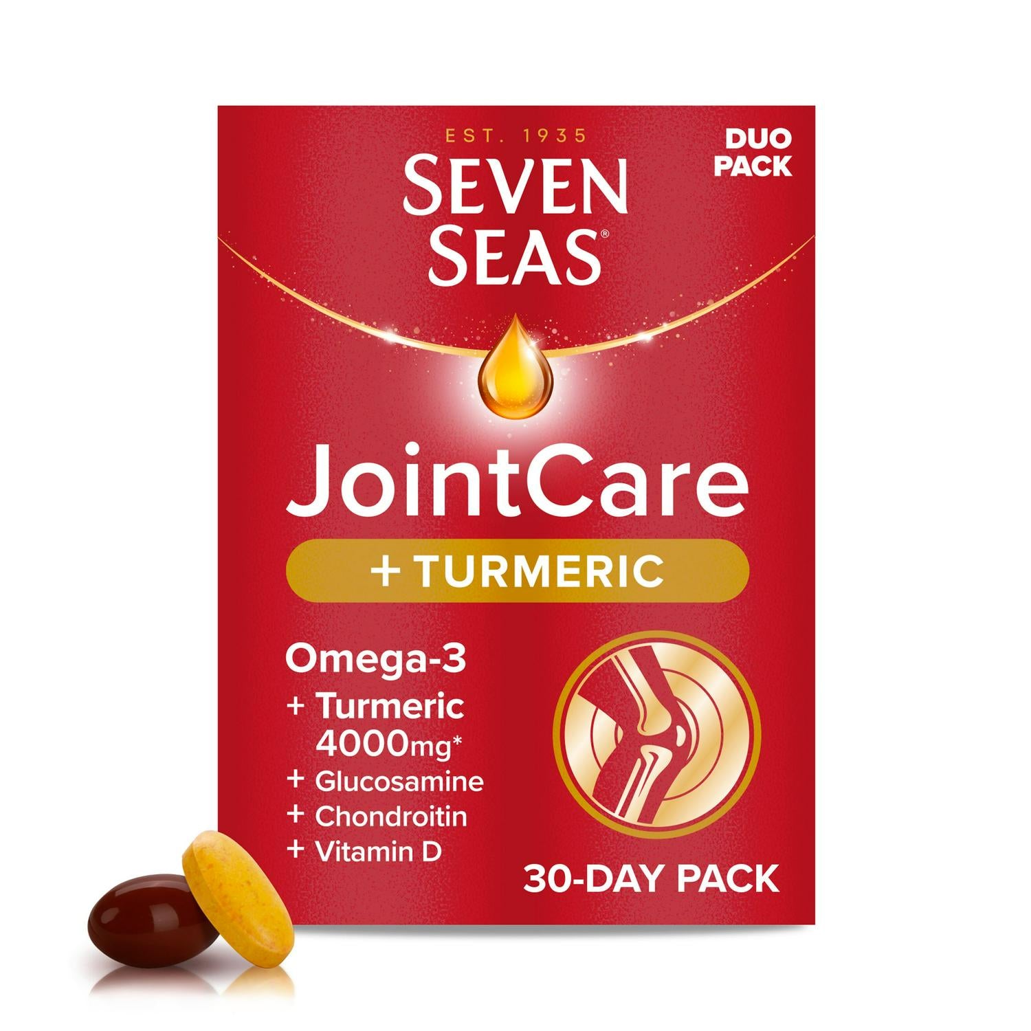 From the UK’s No. 1 JointCare Brand** – Seven Seas JointCare + TURMERIC has been specifically formulated with Omega-3, Glucosamine and Chondroitin, with an additional Turmeric tablet. Plus, Vitamins C and D, Zinc and Manganese to provide 4-in-1 JointCare Support1-4. It supports 4 important components of your joints: Bones1, Muscles2, Cartilage3, and Connective Tissue4. Like all the products in our JointCare range, Seven Seas JointCare + TURMERIC helps to support an active lifestyle1-4. At Seven Seas, our mission is to deliver the best products, sourced from the ocean, and manufactured to the highest standards. Our ‘Ocean Gold’ promise to you: • Over 85 years of Omega-3 scientific expertise. • Commitment to putting ‘you’ at the centre of everything we do. • No compromises. Seven Seas uses high quality ingredients. How to use: Dosage: Take 1 JointCare capsule + 1 Turmeric tablet a day with cold water during a meal. 1Vitamin D and Zinc each contribute to the maintenance of normal bones. 2Vitamin D contributes to the maintenance of normal muscle function. 3Vitamin C contributes to normal collagen formation for the normal function of cartilage. 4Manganese contributes to the normal formation of connective tissue. 5Seven Seas Omega-3 fish oils are in Triglyceride form, a more absorbable Omega-3 form vs Ethyl esters. 6EPA and DHA contribute to the normal function of the heart. The beneficial effect is obtained with a daily intake of 250mg EPA and DHA. 7DHA contributes to the maintenance of normal brain function and normal vision. The beneficial effects are obtained with a daily intake of 250mg DHA. **Source 2025 NIQ data, Value and Units, Vitamins & Minerals (Client Defined), 52 w/e 11.01.25, Total UK. Verify at seven-seas.co.uk/contact. Box – Recycle. Blister – Don't Recycle.