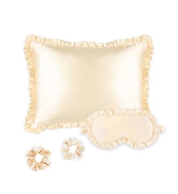 • Includes satin frilly pillowcase, sleep mask, and two scrunchies.