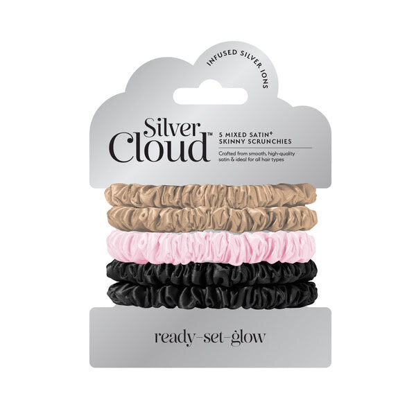 Discover the Silver Cloud skinny scrunchie pack, offering a blend of style and improved hygiene for your hair accessories. This set includes versatile colours like pink, caramel, and black, all crafted from high-quality satin fabric for a luxurious feel.