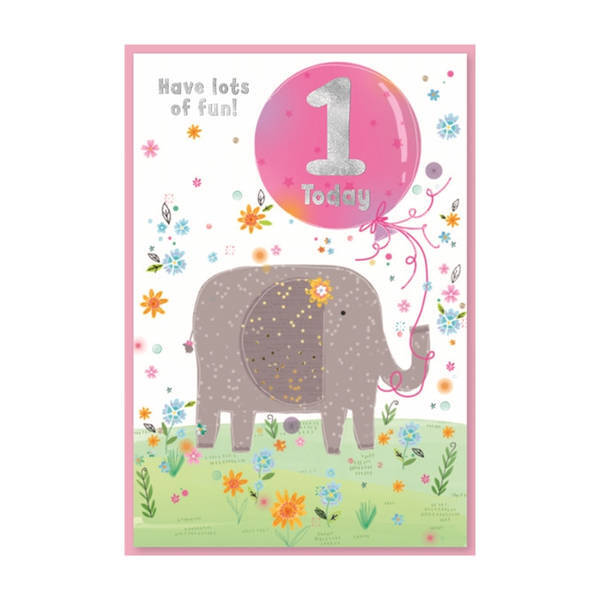 material card design balloon dotted elephant floral plants printed text occasion 1st birthday
