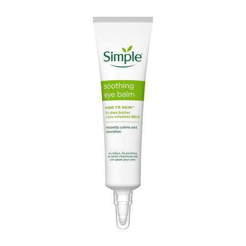 Read MoreThe skin around your eyes is really delicate, which is why it needs some proper TLC. Simple Kind to Skin Soothing Eye Balm is made with the perfect blend of skin-loving Pro-Vitamins B5 and E, 1% Shea Butter, Jojoba Oil and Bisabolol to instantly calm and nourish your delicate eye area. This under eye cream is designed to reduce puffiness and help relax tired eyes, leaving your skin soft, soothed and hydrated. Dermatologically tested, hypoallergenic and non-comedogenic, Simple Kind to Skin Soothing Eye Balm contains no harsh chemicals, colour or perfume, making it suitable for all skin types, even sensitive skin. Our eye care cream is also perfect for vegans as Simple is PETA-Approved Vegan, meaning we don’t test on animals anywhere in the world. The tube is 100% recyclable – please recycle (tube is PE, cap is PP). How to use: Apply a small amount of the balm to your eye area and gently pat until absorbed. For best results, use as part of your morning and evening skincare routine. Avoid direct contact with eyes. Discover the rest of our Simple Kind to Skin range to keep your skin soft, smooth and healthy looking. *2024 NIQ data, Unit Sales, Face Care (client defined) w/e 24.02.2024 (GB)