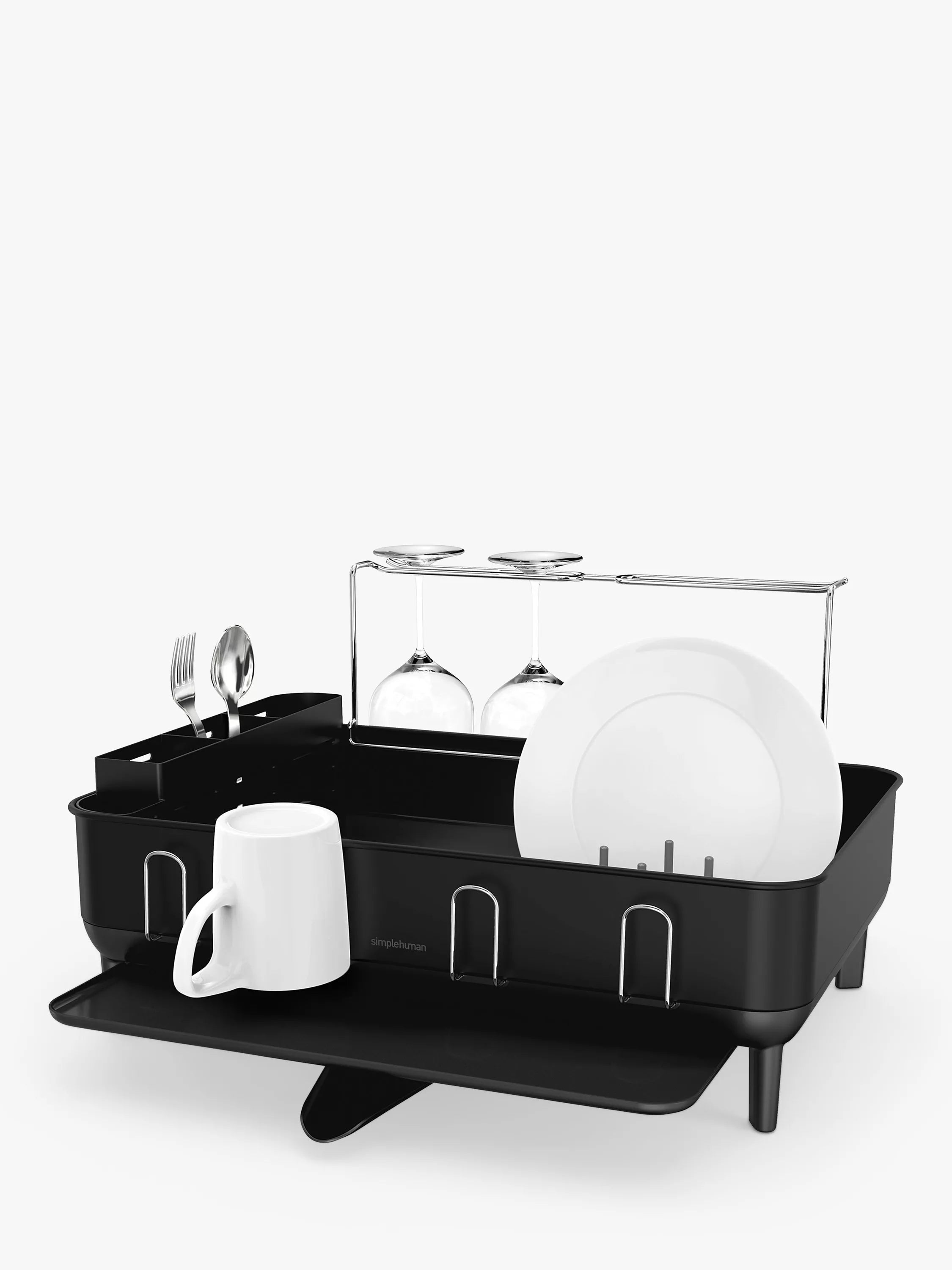 simplehuman's silicone-capped wire rack holds dishes tightly without scratching or chipping and the wine glass holder hangs up to 4 wine glasses — even those extra-large Bordeaux glasses! A lower profile with anti-slip rubber feet gives the dishrack greater stability and keeps it firmly in place.