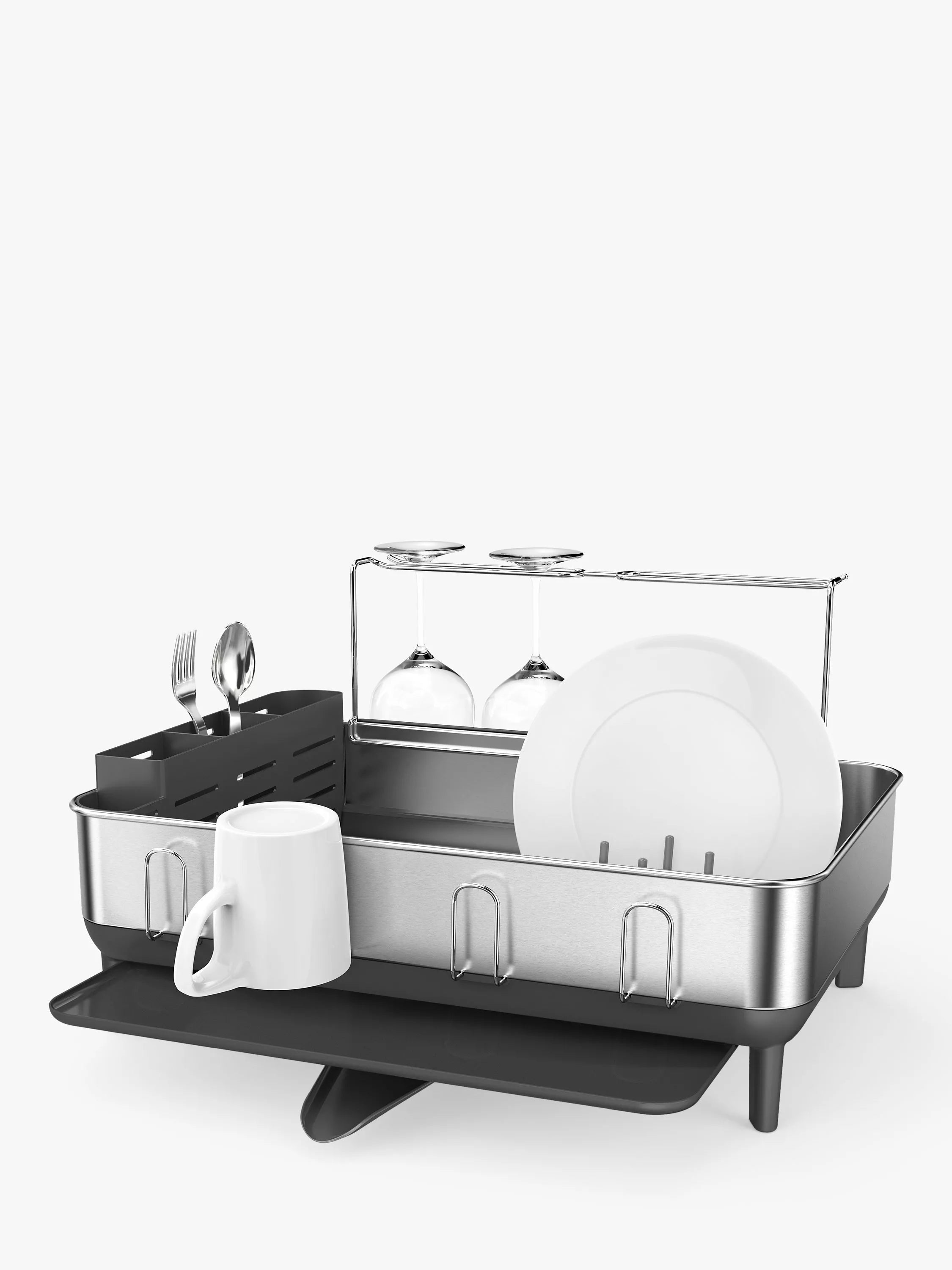 This steel frame dish rack has a solid stainless steel frame that matches the aesthetic of many modern kitchen appliances. The swivel spout rotates 360 degrees in any direction so it drains water directly into the sink - no matter how you place the dishrack on your countertop - and can be removed for easy cleaning.