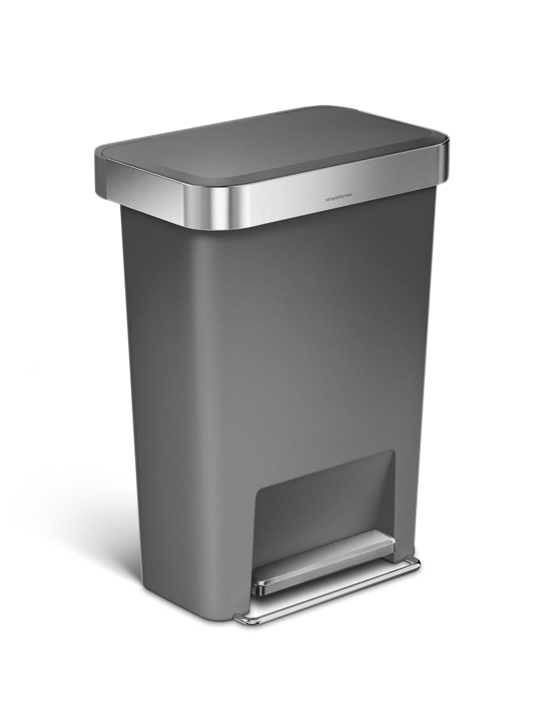 The simplehuman rectangular pedal bin features an innovative liner pocket that keeps liners at your fingertips for a faster liner change. Just slip a liner refill pack into the liner pocket to dispense fresh liners one at a time – no clumsy perforations or unravelling. The bin s stainless steel liner rim grips the liner and keeps it hidden. Strong wide steel pedal is designed to last, and our patented lid shox technology ensures a smooth, silent close every time. Code K liner refill packs store perfectly in this bin's liner pocket.
