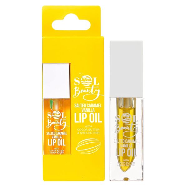 Experience the indulgence of Sol Beauty Salted Caramel Vanilla Lip Oil for daily lip care. This treatment is specifically enriched with cocoa butter and shea butter to effectively nourish and soften your delicate lip skin. It dries to a clear, non-sticky finish, delivering a subtle, natural shine.