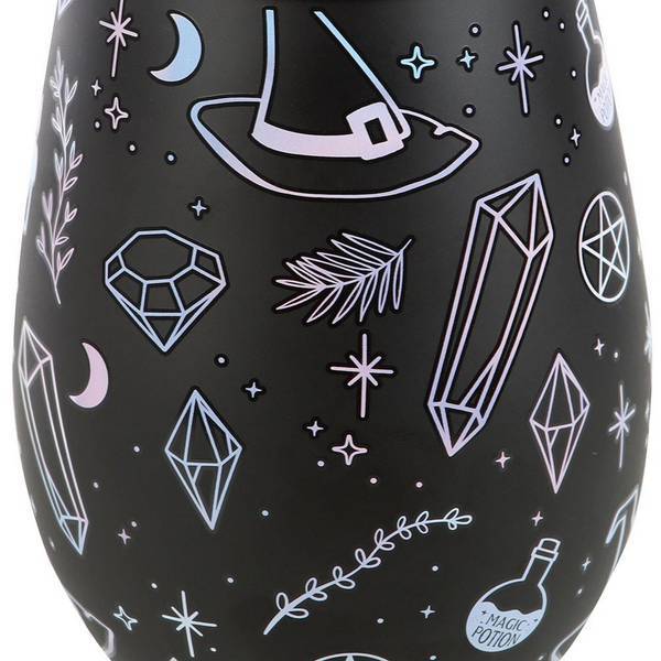 Introduce an element of mystique to your glassware collection with this striking stemless wine glass from Something Different. This unique piece is decorated with witch-inspired graphics, including crescent moons and potion bottles. It is crafted from durable glass and arrives protected within its own branded cardboard packaging for gifting or storage.